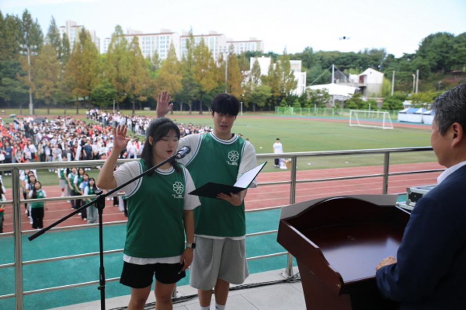 26일 논산 창의융합캠퍼스에서 열린 건양대 2024 한솔체육대회에서 학생들이 선서를 하는 모습.jpg