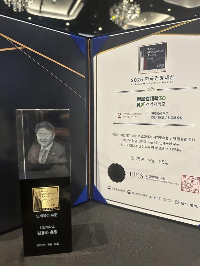 건양대학교 김용하 총장이 산업통상자원부 산하 산업정책연구원이 주관하는 ‘2025 한국경영대상’ 인재육성 부문 대상을 2년 연속 수상했다. 이는 “‘가르쳤으면 책임진다”는 확고한 교육 철학 아래 대학과 지역사회가 동반 성장하는 혁신적 인재 육성 모델을 성공적으로 구축한 성과다.